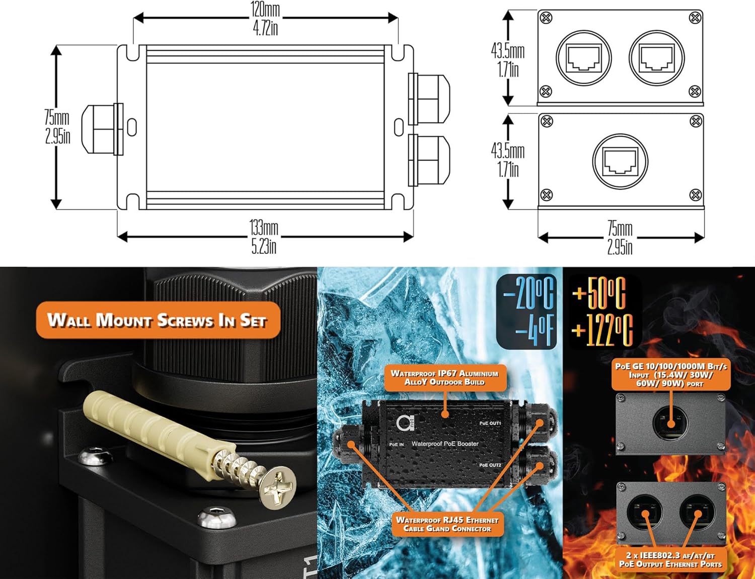 Waterproof PoE Extender Repeater Booster, Outdoor Gigabit PoE Amplifier with 2 Output Ports, IP67, 802.3af/at/bt, Up to 90W Total, No Power Required